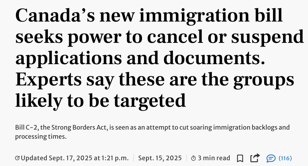 2025年9月15日,加拿大媒体《多伦多星报》披露了6月提出的C-2法案《强化边境法案》(Strong Borders Act)最新修订版显示,其中一项条款令人震惊:加拿大移民部长将有权随时终止任何移民申请!
